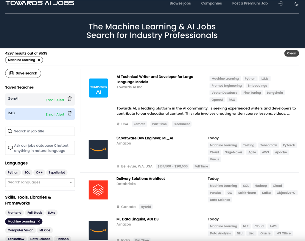 Traditional job boards like Indeed or LinkedIn are not optimized to display relevant results for AI-specific job searches. To address this gap between talent and opportunities in AI, and to facilitate easier matching of skills, we have built the Towards AI job board. Our specialized job board focuses exclusively on AI jobs and has been tailored to process AI-specific skills, acronyms, and synonyms. Our algorithm scans through hundreds of thousands of jobs listed online from over 50,000 companies, presenting only those that meet our defined AI job criteria. We currently show 10,000 live AI jobs.