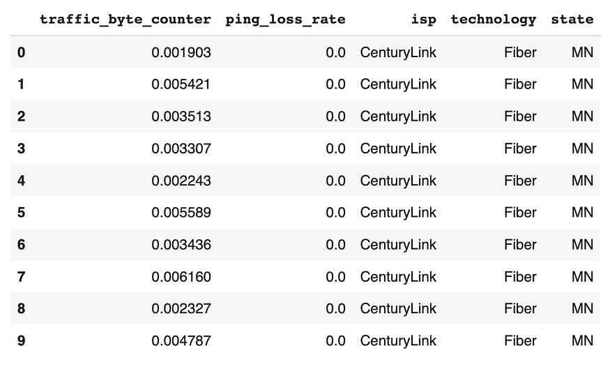 Now we can read the data. We see that our dataset contains 5 features with different behavior: traffic_byte_counter and ping_loss_rate are continuous features, which consist of the measurements of interest. Each measurement is associated with 3 categorial features, or metadata, namely isp, technology, and state.