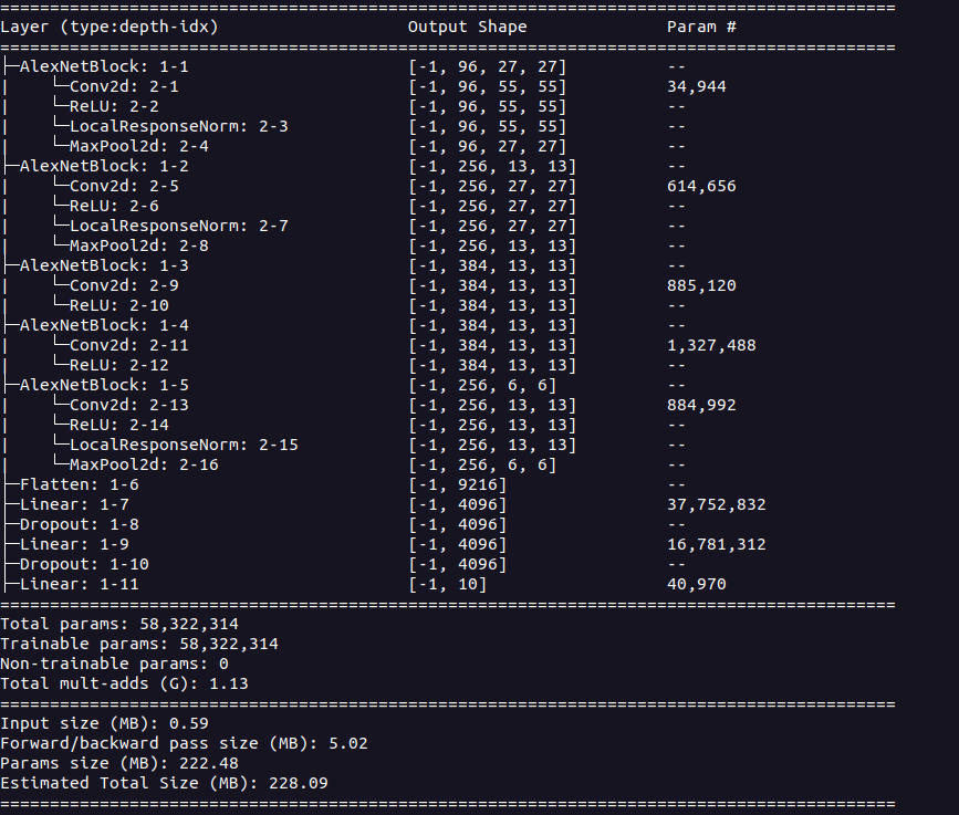 For this specific instance, we need two initialization parameters for AlexNet. One is input channels that are by default three for RGB images. The second is the total number of classes that defines our output size. In the paper, the value used was 1000 for the Image Net task. For my implementation, I use the CIFAR-10 dataset so I set it to ten.