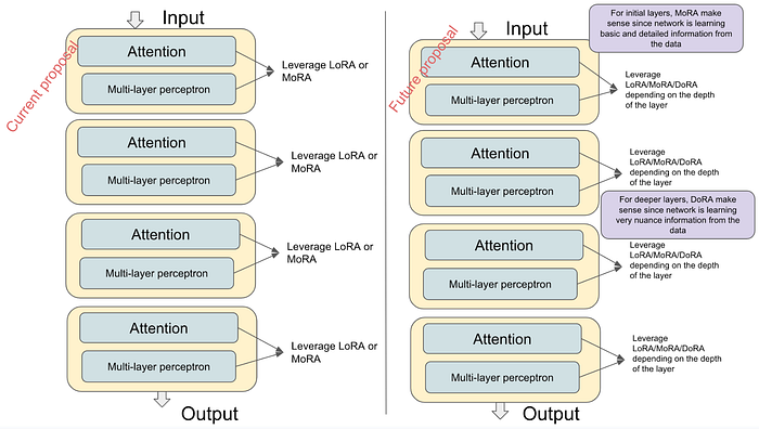 Since a lot of iterations around DoRA/MoRA/LoRA is coming, each one has its own positives/negatives. One exploration is if each layer of the transformer (attention + multilayer perceptron) can experiment with different techniques.