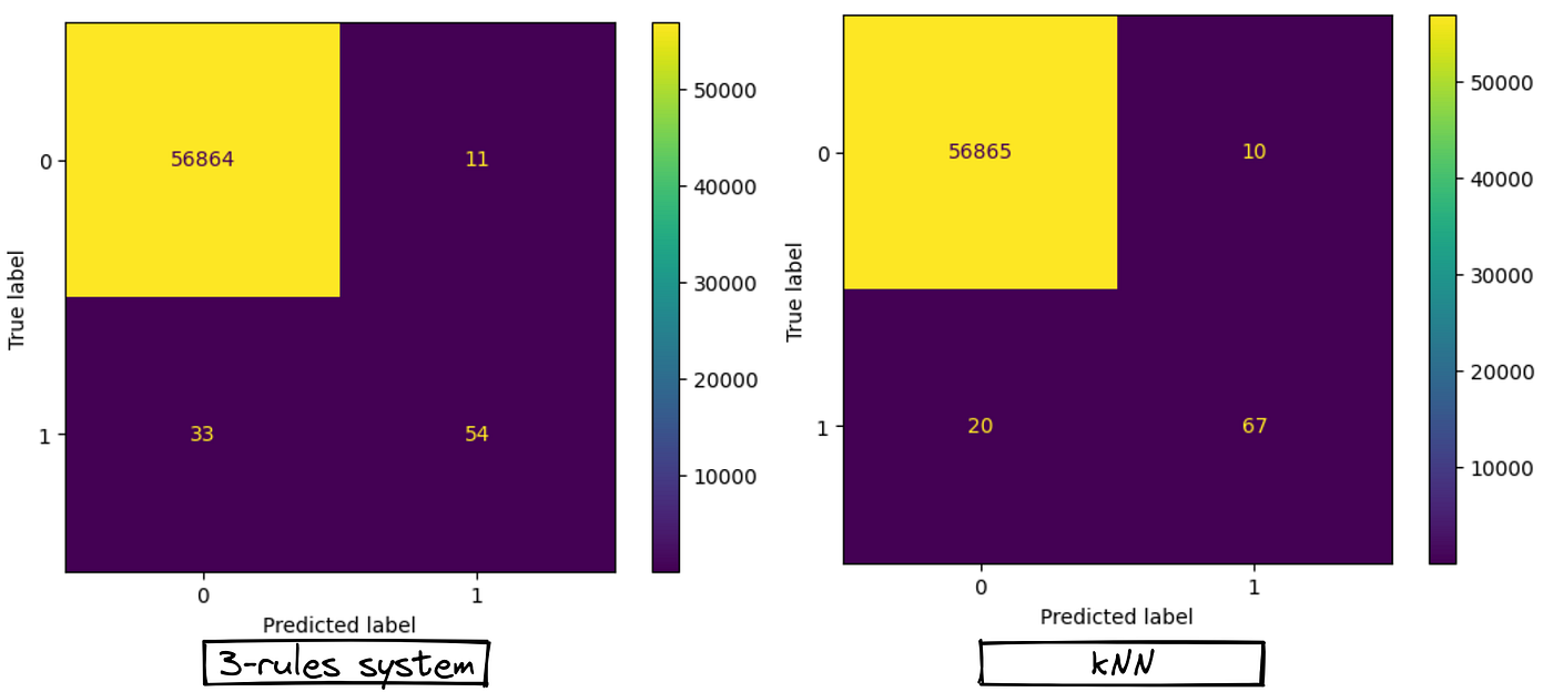 We can compare the results for our pure 3-rules-based system and kNN method, which handles the imbalance quite well: