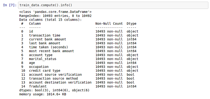 With this, we can say we have an idea of what our data is all about. So our data contains information on transaction time, the current bank amount, last bank amount, time is taken to process a transaction, account type, marital status, and other information provided from each user of the bank. More importantly, we have the feature we are trying to predict or understand with respect to other features which is fraudulent; that is our target feature. We still need to know more about our data so that we can know how to analyze, select the best feature, and transform for perfect modeling. The next thing you may want to do is to have a look at the descriptive analysis of the numerical entries in our data. Dask helps us to do this efficiently by running the code below, and we will have the corresponding output.