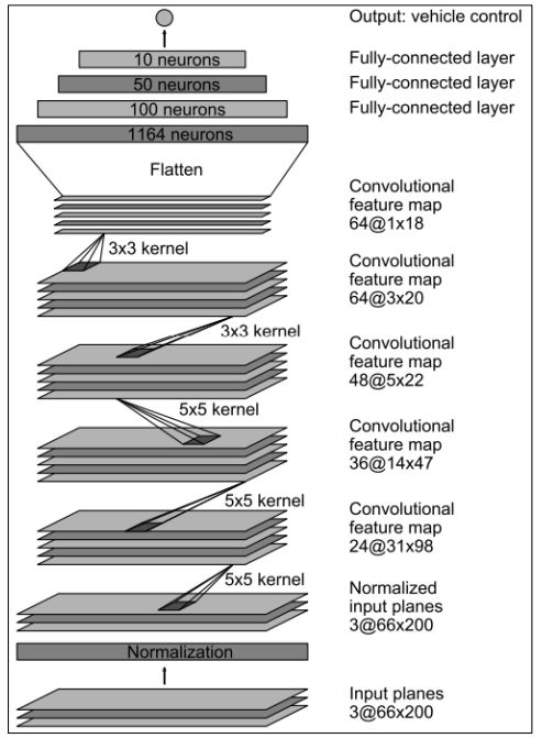 As previously mentioned, a CNN model was used. The model architecture, inspired by the NVIDIA model used in its DAVE-2 system, is shown in Figure 7.