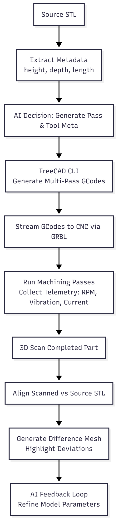 trimesh. - AI Decision — Use trained ML models to determine machining passes, tool type, and feed parameters.