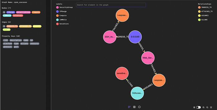 This is a classic CSPM use case. A misconfiguration allows a server to be publicly exposed, and an overly permissive IAM role gives it access to sensitive data. In a tabular view, this would require joining multiple tables and manually tracing the permissions. With a graph, it’s a single traversal query.
