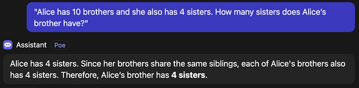 Consider the “Alice in Wonderland” example from Part 1, where researchers asked LLMs: “Alice has M brothers and N sisters. How many sisters does Alice’s brother have?” With M=10 and N=4, when posed as a direct English question to Poe’s Assistant model, it responded that Alice’s brother has 4 sisters.