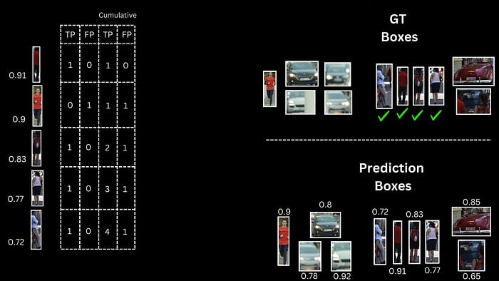 We will calculate the True Positives (TP) and False Positives (FP) for the Person Class. Then, we will create cumulative TP and FP columns from top to bottom.